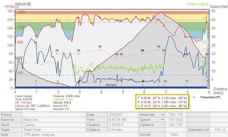 Overall time on the ride is not that helpful, because the first 2 and last 2 miles are nothing but downhill, and sometimes I can really cruise, and sometimes there's traffic or construction. The middle 5 miles of the route is just a steady couple of climbs, but I always forget to hit the lap button at the beginning of the main climb and again at the end. I can mess around in the HRM software, selecting portions of the ride and looking at the pop-up selection info, to do a virtual lap measurement, but it is ultimately not very useful.