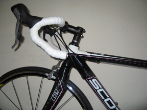 Normally I don't have a tendency to anthropomorphize objects but this bike is definitely a she :D. She's a Scott Contessa CR1 pro. I actually ordered an xs frame, but swapped out for longer, standard cranks instead of the 165mm compact that came stock. The brake levers are Shimano R700, and the reach is noticeably shorter -- I think I'm going to like it...
