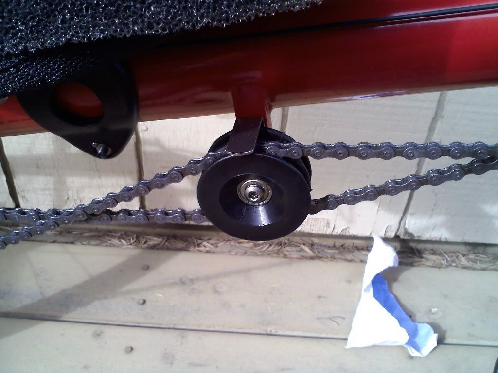 Here's my question: The chain is incredibly long, and as a result sags something fierce. The Xtracycle web site doesn't have very helpful information about dealing with chain sag, unfortunately. After trying to use a chain tensioner but not having that work, my bike shop guys put an orange roller thing to hold the chain up, as you can see here:
