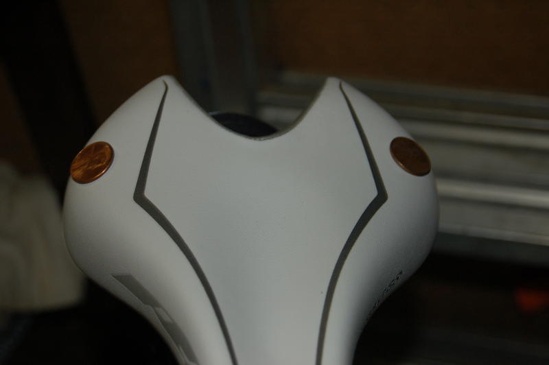 Here is the saddle, with pennies depicting where my sitbones hit (highly scientific):
