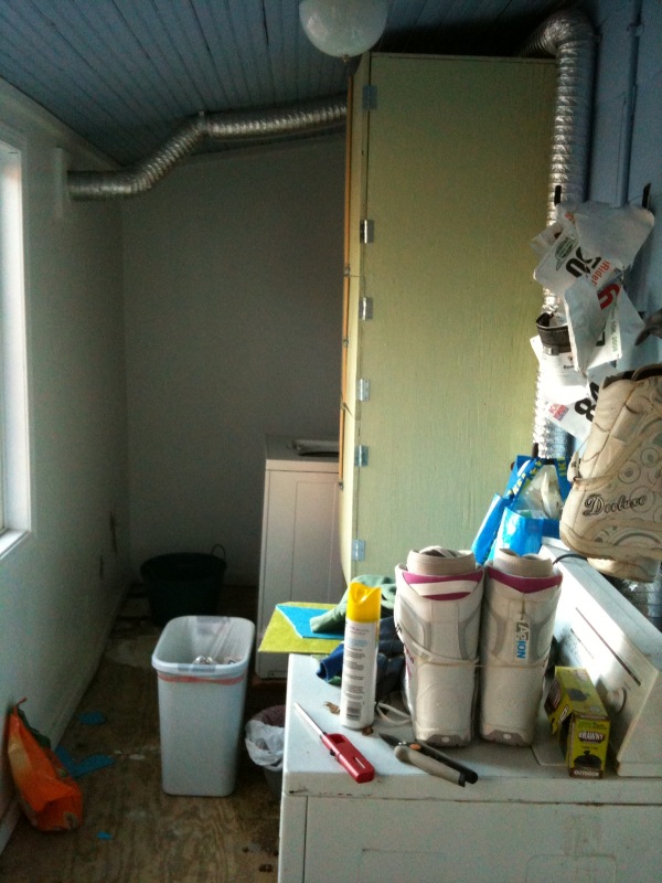 The wall to your right is asbestos siding, as it was once the outside of the house. The floor is plywood over concrete (I think) but I have a pile of vinyl composition tile to put in when it's warmer out there. The green monstrosity is the linen closet accessible through the old bathroom window. I'm not sure the walls actually meet the ground on the left, but there's baseboard up so it's hard to tell.