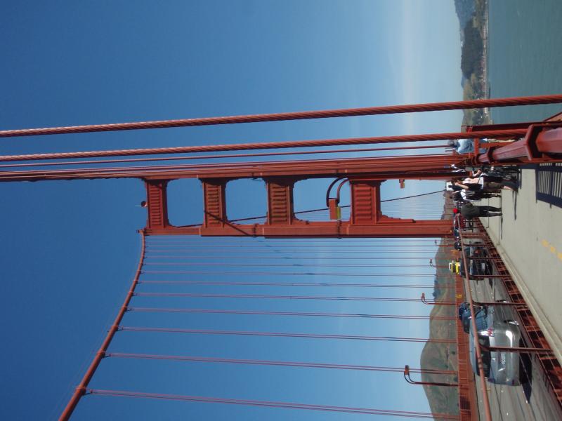 We rode past all of Fisherman's wharf and out along the water side to the Presidio on bike path. Then we hit a long but not horribly steep hill and a shorter steeper hill, both of which were highway but the traffic was light ( we rode on a Monday but I'm sure if had been a weekend it would have been crazy.) The two hills and a bit more of false flat and we were on the bike/walk path on the east side of the bridge. Things were a bit congestd right at the beginning of the bridge because of the pedestrian traffic but when it sorted it self out, it was easier to maintain a nice easy 3-5 mph and since we were on the East side, we had a full view of the city scenery. They trade to paths to alternate sides depending on the time and day. Since we hit the bridge at 10:30, the wind was fairly low and there was no rush hour traffic. The ride was smooth except for at the points where the spans came up through the bridge, then you had to do three short sides of a square and the was the possibility of someone coming in the opposite direction coming around the corner at you. Luckily there were only two of these.