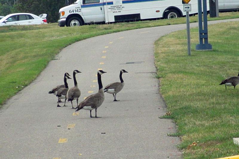 One of the trails I rode on in Ohio followed a river, and there was some nice grassy areas on one side. I came around a corner and--GEESE. Geese everywhere. I got off the bike and walked through them. They seem to be less angry and more apt to get out of the way once they figure out what you are. (This was roughly this time of year, though. No babies.)