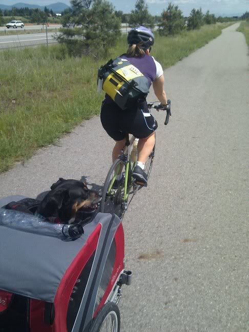Today was her first actual ride being able to stick her head out of the sunroof - my husband rode with us and kept an eye on her. She did awesome and definitely enjoyed it more than being closed in. She took in a lot of information with her nose and did some woofing at surprised passers-by. ;) A tiny bit of whining on the way out/back, but she got into the trailer without any stress, she sat down, she let me roll her through the office to the bike, and she rode most of the way without scratching or anything to "ask" to run (or just be let out) instead of ride. I want to get to the point where I can let her out of the trailer, she can run for a while on protected areas or at the dog park, then she gets back in and we continue our ride through streets and crowded terrain.