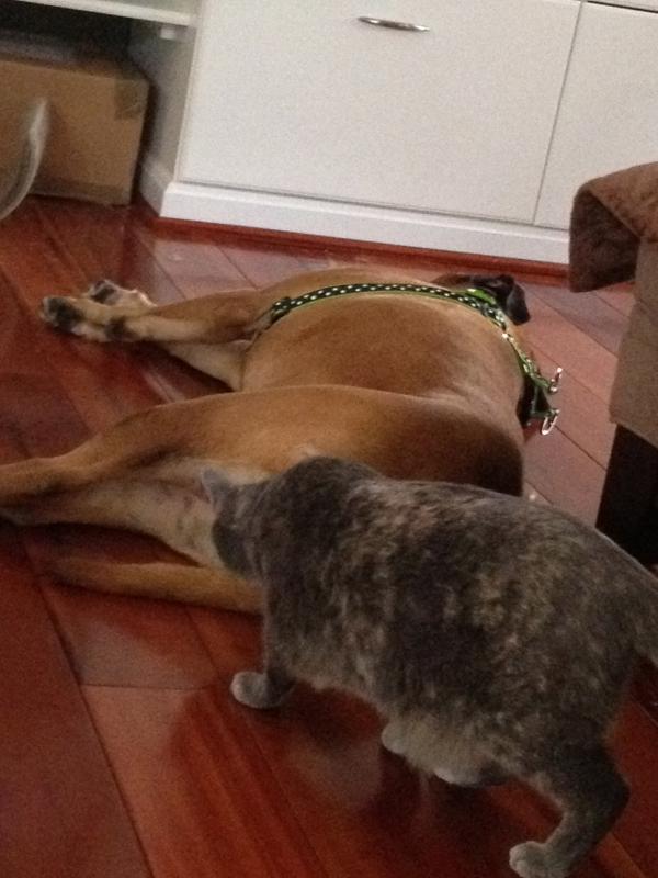 So I'm guessing my girl cat here is going to adapt to the dog a little faster than the boy, who ran to the bedroom immediately and hasn't come down since. :)