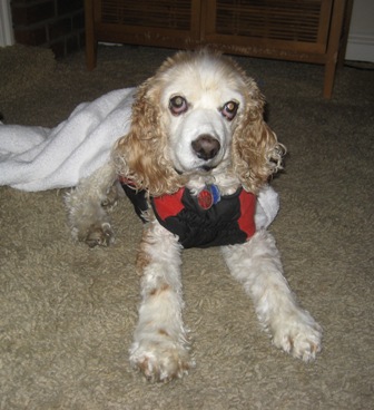 I took a picture of my 14-year-old dog Remy this morning that is both really funny and sad. He came down from upstairs dragging the towel that I cover him up with at night (he wears a sweater, sleeps on a heating pad, and is covered by a towel) and laid down beside me in the office. He had such a funny expression, with his lip stuck under his teeth, that I had to take a picture.