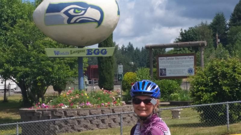World's Largest Egg, Winlock, WA in the background! We are getting ready for STP in 3 weeks. We rode from home through beautiful, low traffic farm country. Lots of hills and valleys. We are so lucky to have such great riding right out our door! We rode 91 miles. SSAttachment 17665