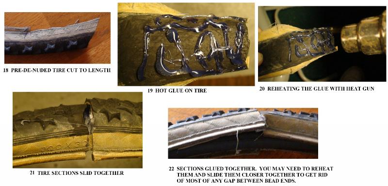 Fit the two ends together so that the two sets of cut bead ends touch. Then, glue the two ends together using hot glue. Hot glue is great because it can be remelted if you make a mistake and stays flexible. I just put hot glue on the denuded tread and then reheated it with the heat gun before fitting the tire sections together again. Photos 18 - 22 Attachment 17874