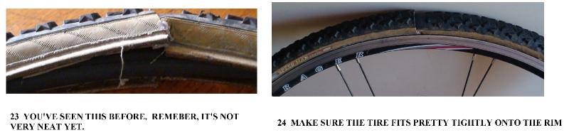 Put a 650c tube into the incomplete tire and fit it onto a 650c rim. It's not very neat looking, yet. Make sure the bead is inside the hooked rim and inflate the tire with about 10 lbs. pressure. If it's too loose, then take it off, reheat it and slide the two sections together more tightly. You may need to cut some bead off if you made it too loose to start. Photos 23 - 24 Attachment 17875