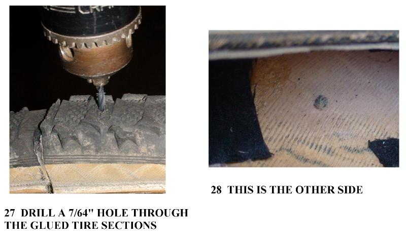 Take off the tire, remove the tube and drill a single hole through both sections of tire using the 7/64" bit. Try not to drill your hand. Choose a point maybe 1 inch back from the cut end of the top section and in between the bigger knobs. Photos 27 - 28 Attachment 17877