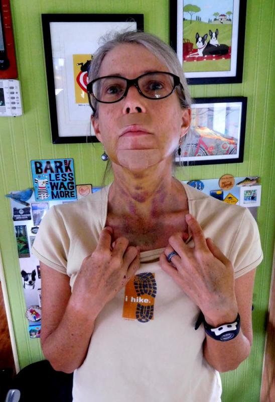 I was riding the Log Lady, late yesterday, and lined up to climb over a large three foot high bolder that I had climbed over 100s of times. I remember getting the right line and the right speed and I remember climbing it. That's the last thing I remember until I found myself on the other side, me laying on my side, looking up in the air. Just laying there and gasping in pain. I did the proper inventory of the body parts before getting up. All seemed in tact. When I got up, though, my neck and adjacent shoulder area were screaming with pain. Fortunately, this took place on a section of trail only 30 yards from the house. Wheeled the bike inside the house and my husband and I were both shocked to learn that the left side on my face was torn and battered with two huge goose eggs growing fast. Tried to rest a bit, but the pain in my neck made it impossible. Off to the hospital emergency room we went.