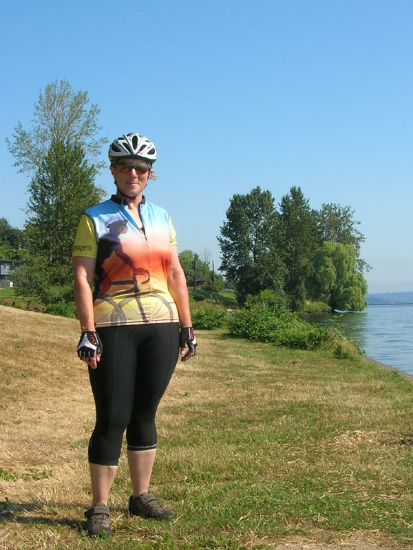 What worked for me with the She Loves Hills, is that while the M fit me in width like the Flourishes and Filagree S did, it gave me a little more length which I needed, and it had a more traditional length sleeve without elastic. I just detest capped and/or elasiticized sleeves. In fact, the M She Loves Hills is quite slim fitting, whereas the other 2 styles in medium looked too loose and boxy on me. My body type is broad shoulders, well endowed boobage, but slim waist and hips (kind of V shaped). As soon as I saw it on model Susan, I knew it would work for me. Now, I know I am being picky here, and while I was willing to spend this much money on a jersey, in part to thank Susan for providing this site for us, in order for me to spend so much on any item of clothing, I have to really love it.