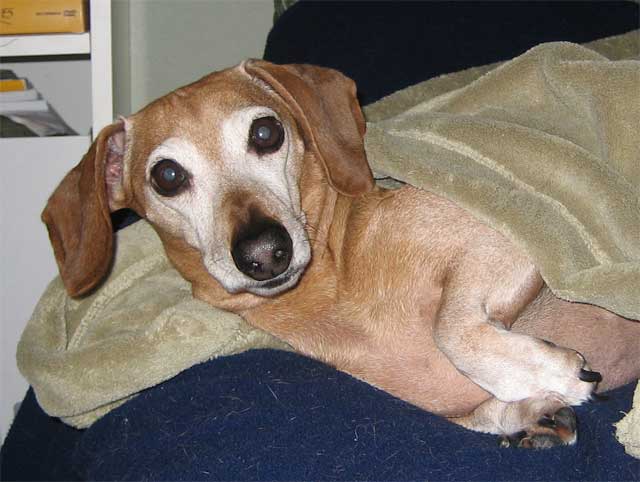 This is an updated picture of Chili, the senior dog. He's 11 now. He still thinks the puppy is a pest, but they're starting to wag their tails at each other. We have hope. He loves his soft blanket...