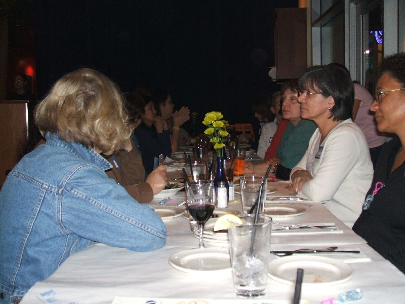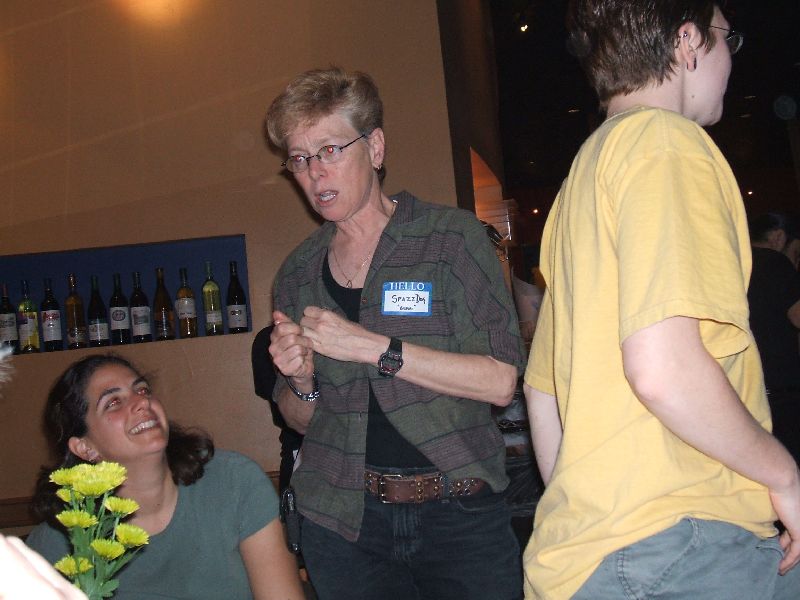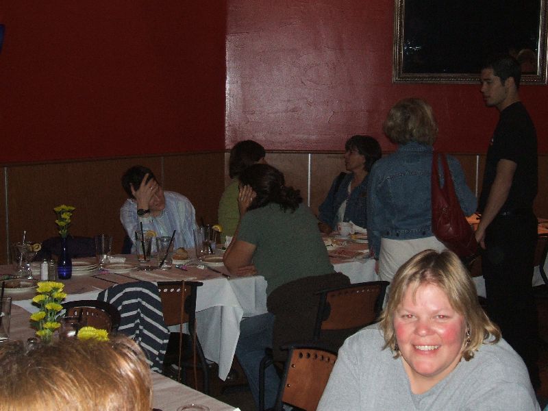 That's me in the first dinner picture in the white shirt - looking, but not feeling, rather glum. Also in that pic are my friends (non-TE-ers, as yet) Shelley, in the denim jacket, and Maren, in the black shirt. Kjay is to the right of me. In the next shot with Spazz is Lisa, another from my group, and Kit, in the yellow shirt.