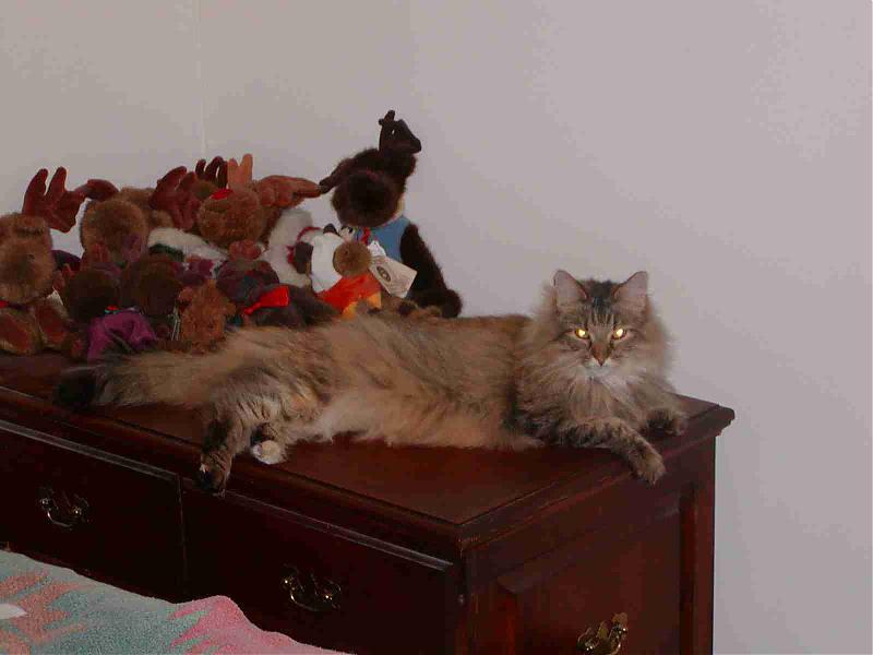 Here they are, my babies. Ariel has silky sepia-grey long hair with fuzzy light grey hair underneath. She's a fluff ball. She's also a scientist, with a concentration in gravity. She causes things to submit to gravity, and observes them very closely. She jumps down and sniffs them carefully to gather more data. Then she walks away, no doubt to write up her report. This first picture was taken when she was pretty young. They're both about 17 now. Isaac is my snuggle-bug little guy. I got him when Ariel decided to take a stroll outside without mentioning it to me, and was gone for 7 awful days. When she was found, she'd lost 20% of her body weight. She *runs* from open doors now. She despised Isaac for about 6 months, tolerated him for about 2 years, and they adore each other now. They are my littlest hearts.