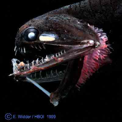 "This deep-sea fish, Photostomias guernei, has a built-in bioluminescent "flashlight" it uses to help it see in the dark."