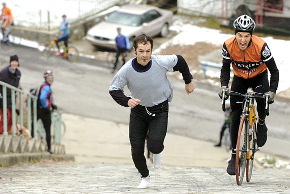 No fair, that's snowy/icy, and the runner is in stocking feet. :eek: He's obviously got way better traction than the cyclist. Even on dry pavement, I do have to work to keep my weight back, or my rear wheel will slip. Let's take traction out of this discussion I think! :p