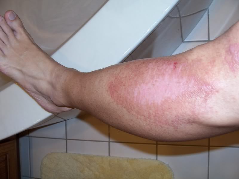 You'll see the pink skin in the center which is 99% healed. But look at the scaly rash from the allergic reaction to the Bactracin! The blisters have settled down, but the itching is terrible and the scaley skin is nasty!