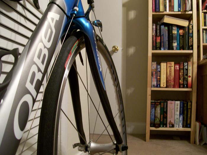 It's a fully 105-equipped bike, with carbon fiber seat and chain-stays, seat post, and steerer. I have a Specialized Lithia 105 seat on it and a lovely wingbar. I had actually wanted a Roubaix, and we were supposed to get one, but the store had unknowingly sold it before they told us about it. However, the shop is new and wanted some return business, so they sold the Orbea to me for $1100. It's pretty ridiculous. I had not even looked at the Orbeas because they were so expensive. However, I now have the most beautiful bike I have ever owned. I rode it a few days after I got it, and it rides like a dream. I'm in love...