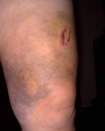 Ah, the leg dent - sign of a true mountain biker. I got mine thanks to an over-the-bars incident that occurred when I was being indecisive about whether or not to get cocky going over a simple trail obstacle - would've been fine either way if only I'd made my mind up before I got there! Thankfully, the lumpiness went as the bruising faded.