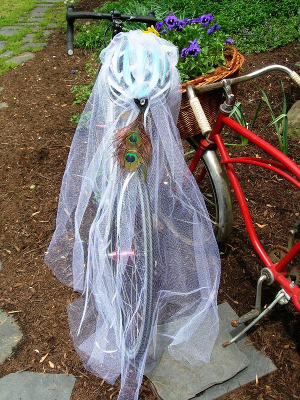 Last week I worked through Wednesday. I did take off an hour early on Wed. to drive over to Harrisonburg and get the veil. An artsy friend designed it for me and installed it onto my helmet. I was off Thursday and Friday. Thursday I worked like mad cleaning the house and getting everything ready for company. That afternoon DH's brother arrived from PA. DD came in on the train that evening. Friday was spent continuing to get everything ready. It is amazing how much work there is to a small, laid-back wedding! My mom got here at about 2 p.m. on Friday, then at 4:30 we met at the ride-start location for practice. Following the rehearsal we all went to the local watering hole, the Pig 'n' Steak (fried dill pickles!), for dinner. The weather Friday was perfect - sunny & 80 degrees. The forecast for Saturday was cloudy with a 70% chance of showers and thunderstorms. great.