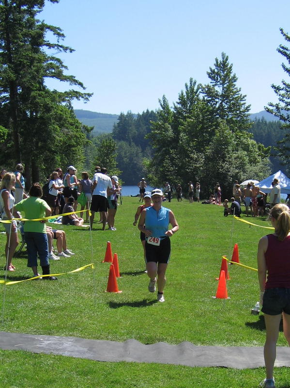 Bike: I felt good, but the hills were big and many and I went out VERY fast, and couldn't seem to tell myself to hang back and let the legs relax a bit -- a friend has told me over and over -- "save the legs for the run". I don't ever listen well - -have to learn the hard way! I had to stop and give a tube to a gal who had already used hers and got yet another flat! But, I have to thank Coach Troy here -- the UPHILL GRIND helped.. I passed many men and women on the hills!