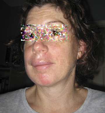 I jump up, wiped on away from my lip and started running up trail (which meant I had to go back by the nest when they calmed down...arg) As I was running away one got me in the crotch area of my thigh...I ran into a family hiking and what luck, they were internal medicine docs! What better company when being swarmed. Then on my upper arm...geez, will they stop??? At some point one got me on the butt...that seems to be their favorite spot to get me