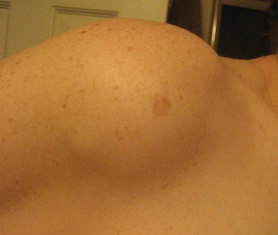 Before I decide to go to the doctor about this, I thought I'd see if any of you have any idea what this weird bump is on my shoulder. It's about the size of a button, and there are two of them close together under the skin. I've attempted to take a picture, but it's a little tricky to operate the camera at such close range with my left hand. If the big mole is at the center of a clock, the button is at about 8 o'clock. Thanks!