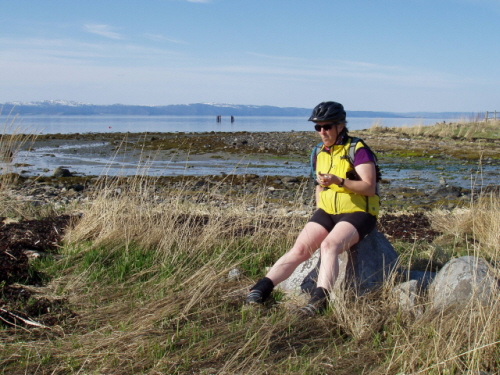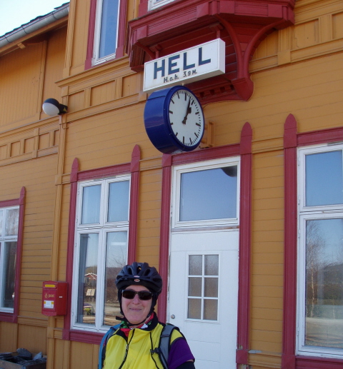 I did it! I made it to H€ll and back! That's a hilly 44 miles (well, actually 40, but we added on 4 more and visited DH's cousins who live on the farm where DH was born ... just outside of, yes, H€ll!). As for the ride ... I did pretty well except on the longest and steepest hills. I made all the hills until the one up from Hommelvik. That one's a mile long and about a 15% grade. I tried dividing it into chunks, standing off the bike to let my HR drop every time I hit my 95% mark. After 3 chunks I gave up and walked the top third. Even walking at 3mph my HR was at 85-90%! But then I made the next hill from Muruvik up to Gjevingåsen. Coming back I walked the even steeper and longer climb from H€ll bridge to Gjevingåsen. But I managed the next steep climb from Muruvik to the crest above Hommelvik in two chunks. Then I walked a moderate hill in Malvik to give my shoulders and butt a break and a steep quarter-miler in Ranheim because my quads felt like jello at that point. But even after that hill, when I thought I was probably exhausted, I still did 10-15 mph on the flats through Ranheim and made it up the last hills home. YAY! Or, well, ok... So I'm not really in shape for the ALC. I've probably reached my peak form by now, so I'll wind up walking hills on the ALC too, and I may not finish all the miles every day either. But I'll do my best, and very likely set new personal records for mileage, climbs, day-after-day rides etc. Good enough for an old lady. I'll be 60 a month after the ride, after all. Meanwhile, hugs and butterflies to DH who rode as my support on today's ride.