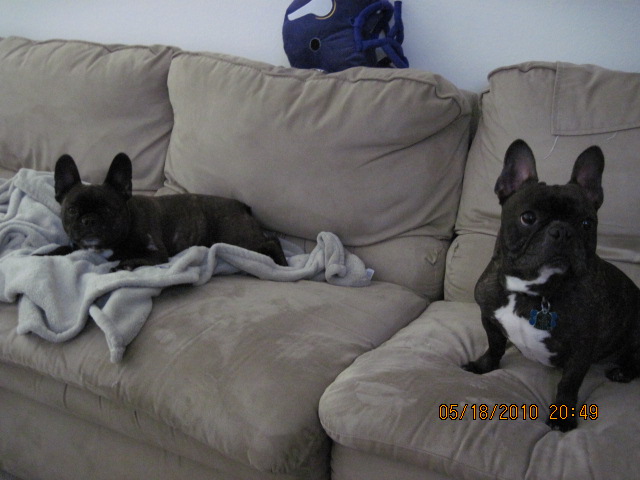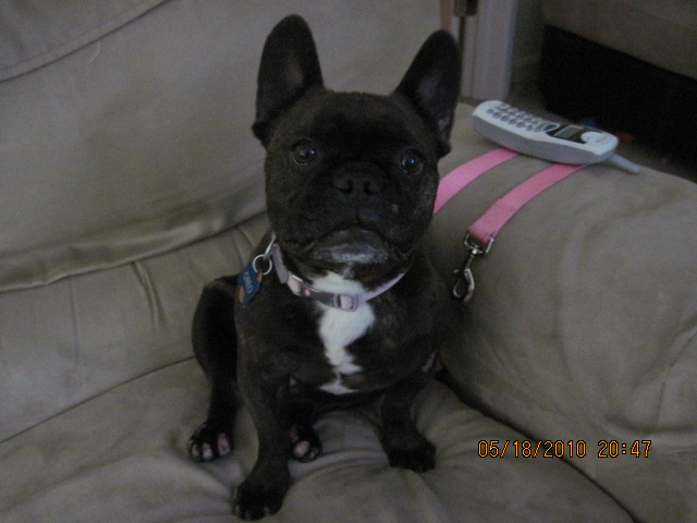 Well, I picked her up today from the airport!She is such a calm, loveable Frenchie! I feel bad for her paws. Her toenails are pretty much gone, and are growing in slowly. Her paws are still a bit raw. She has some scrapes and missing fur on her legs. She met Guinness and the 2 cats today. Guinness loves her already, and has kissed her face repeatedly. I think she could care less about the cats, which is nice, since Guinness already likes to try to play with them. Guinness and her have gotten into a few scuffles, but no biting. I think she is just used to being by herself??? We don't know her history, so we will see how it goes. She has been crashed out all day except for eating her breakfast and going outside to go potty. She does NOT like being put into her house (crate). I went to get some lunch, and she screamed bloody murder when I left, so bad you could hear her outside! Not sure if anyone else on here owns a frenchie, but they make a funny howling noise!
