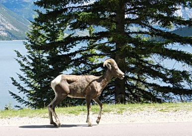I swear we must have seen the next generation of wild bighorn sheep at Lake Minnewaka area which is a turn off from the Banff Legacy Bike Path, about 10 kms. or less before Banff. There were well over 20 of them placidly gazing at the tourists, cars and odd cyclists like us.