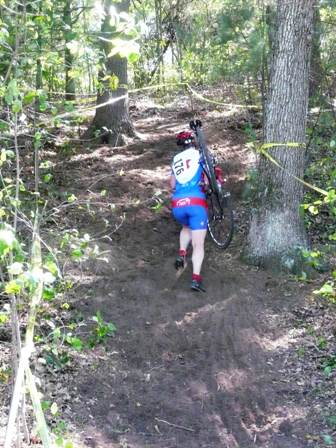 I let 2 women pass me on the run up at the top on the second or 3rd lap thinking I should go ahead and give it a try and ride down that hill. I wasted too much time trying to reclip and get enough nerve to go down it! This is a limiter for me. As a triathlete, I'm hardwired to go AROUND sticks and rocks, not go over them! Cross is so different and challenging I just enjoy that part. Forcing myself to do something that scares me a bit and forces me out of my comfort zone.