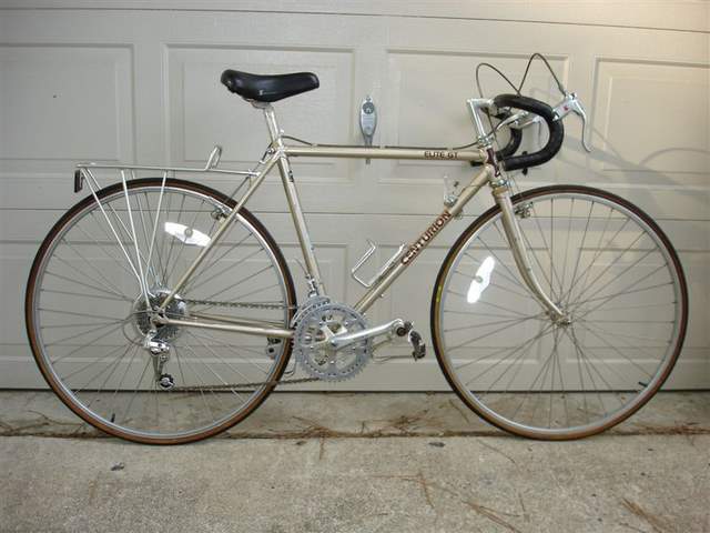 A 1983 Centurion Elite GT touring bike. It's in really good condition and all I really need to do to it is upgrade the brake levers, grease the moving parts, and get a little superficial rust off.