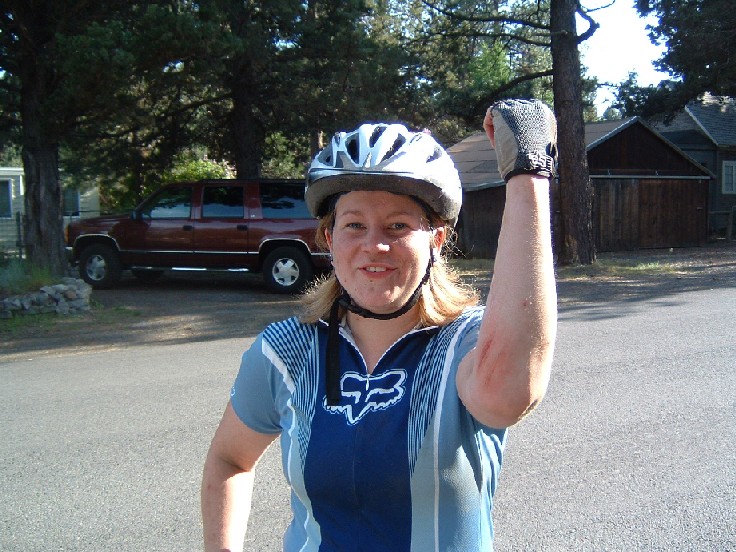 The bait worked. Smurf joined us for a ride on the long loop at Sisters (Peterson Ridge). She hung out with us old folks and joined in our silliness. She said she wouldn't jump the canal bank, but, oh no, it was too tempting.![]()