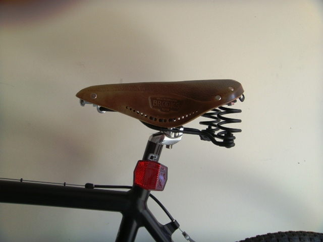 Well I just received my new Brooks Flyer, Pre-aged today in the mail. I slapped that bad-boy on my bike and off I went for a 10 mile ride through Clifty Falls State Park. My sit-bones didn't hurt at all, but my girly-bitz were not happy! They were ok when I was riding on top my bars, but when I rode down in the drops, they started to hurt. I also feel like i have to keep scooting back in the seat to get comfortable. I've including pics of my bike so you could see how I was riding it.