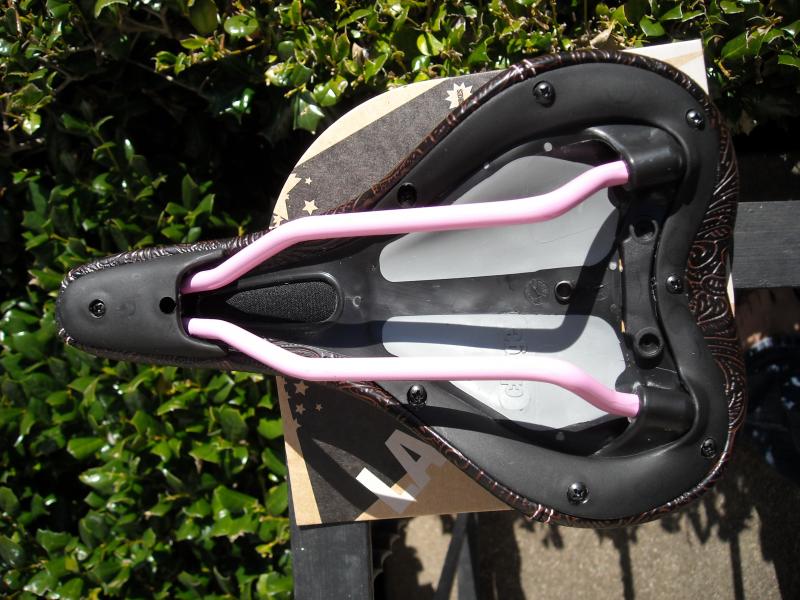 "Luna pink" might match that gorgeous saddle. Check www.lunacycles.com and look at the photo gallery. There should be at least one "Luna pink" frame there (I just checked, there is: it's actually my much-beloved Orbit--purple/"Luna pink" fade paint). It's a rich pink, neither too fushia or too pastel.