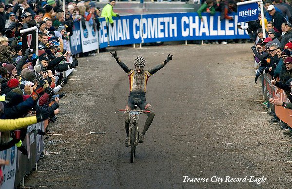 The course was not technical. But it was slick from the snow and ice and the single-track was really muddy, like peanut butter. Every time we hit a section of single-track, we'd have to slow down to a near stop because of the traffic jams of slow and inexperienced riders in front of us. We'd bide our time behind them or try and leap-frog them through the woods. Once we got to an open section we'd fly past dozens and dozens of racers.