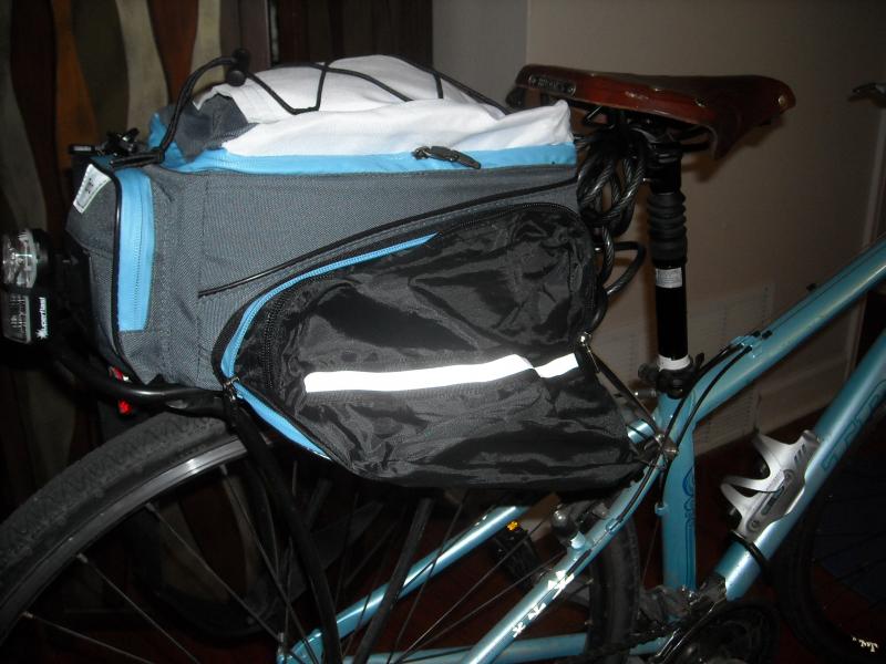 I also have an Axiom Laurentian trunk bag that is really neat. The main compartment will keep your food hot or cold, there several external pockets, bungee on top, velcro straps to secure it well, reflective tape, it's waterproof and it comes with a shoulder strap.