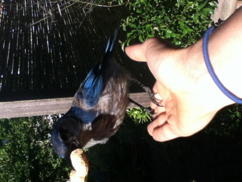 Ha! Are they scrub jays? I had a scrub jay perch on my head for about 10 minutes once on a nature walk. Glad I wore a hat!