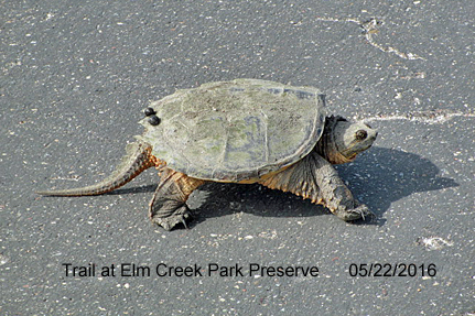 I think the two black things on the back of the shell are leeches. This turtle was very far away from the water. I hope he found his way back but he was headed for the parking lot when I left. I might have helped but I am pretty sure that's a snapping turtle.
