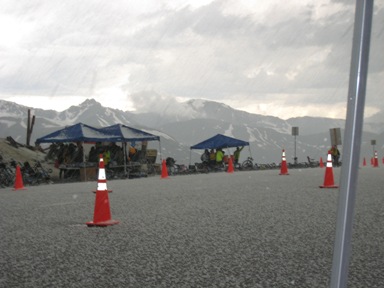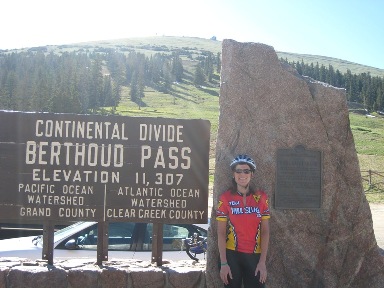 Starbucks hit the spot in the morning and we were off for the much anticipated “day 3” which would take us up two mountain passes and our highest elevation for the tour. I get to the 2nd aid station feeling strong. Daniel and I lean our bikes up against a small portable sign despite my instinct that the wind might knock over the bikes. Sure enough I come back to the bikes and Daniel tells me they fell over. Yep, right on top of my very sensitive derailleur- the one I’ve replaced twice in less than two years. I look at the bike, it seems Ok, and I resist the urge to take it over to the mechanic. We still had 40 miles to go and about 2000 feet of climbing. It was now about 11:30 am. The sky didn’t look too ominous but I had been told to be off the top of the mountain pass by 1pm. Within a few miles after leaving the rest stop, my derailleur started acting up. Rather than turn around and go back to the mechanic at the rest stop, I thought I would be ok if I just left the bike in the same gear and continued on to the next rest stop at the top of the pass. I continued riding for about 10 miles in the middle cog of my second chain ring (compact double) but unfortunately I’m not strong enough to get up a mountain in that high of a gear. Sure enough, as soon as I changed gears my bike started acting up, so rather than risk breaking a third derailleur, I pulled over when I saw the SAG. The SAG guy was going to call to see how far away a mechanic might be when lightening struck. Really! At that point, I was not prepared to wait ½ hour for a mechanic and then try to climb up a mountain with lightening and hail. Yep, hail! To top off the day, I ended up losing my Smith sunglasses on the SAG truck. Damn, I was mad! Well, at least I made it up Berthoud Pass (11,315’) and have the picture to prove it.
