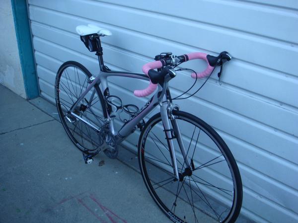 Thanks everybody for helping me accessorize my bike! In the end, I decided to go with a white Specialized Jett saddle, and pink Bontrager cork gel handlebar tape. The saddle has some accents of light pink on it. Call me fashion challenged, but I love it! (Also, I am still waiting for the white handlebar tape to come in).