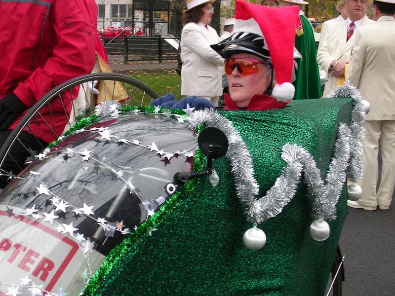 This is how I was decorated a few years ago, for the Portland Holiday Parade (day after Thanksgiving) - Cycle Oregon sponsored a "float" of cyclists, all dressed in red (most in matching jackets) and Santa Hats for everyone. (We all had signs of all the towns in Oregon that Cycle Oregon has been to or gone thru). Every year, my DH and I still tape the Santa Hats to our helmets and wear them every ride in December, sometimes into January. Brings smiles to everyone, especially the kids. And it doesn't hurt that DH has a white beard and rosy cheeks :-)