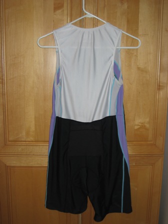 I bought this in 2006 and wore it three times (practice swim, practice bike, and during the triathlon). The lake was kind of murky, and it seems to me that the white part didn't get really white after I washed it. The inseam is 8". (The legs are really the same length, it's just hanging funny.)
