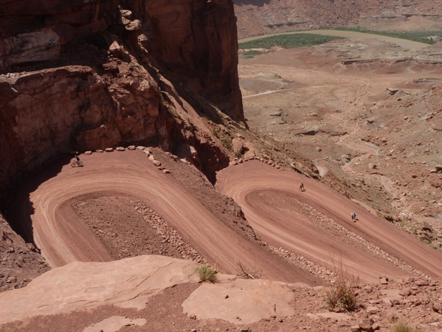 We started the ride Thursday morning in Moab, Utah, with 10 guests, two guides, and two friends of one of the guides. Most of us rented bikes (full-suspension Santa Cruz Superlight) and camping gear. We drove to Canyonlands, and about 11am we started down Schafer Trail. What fun!
