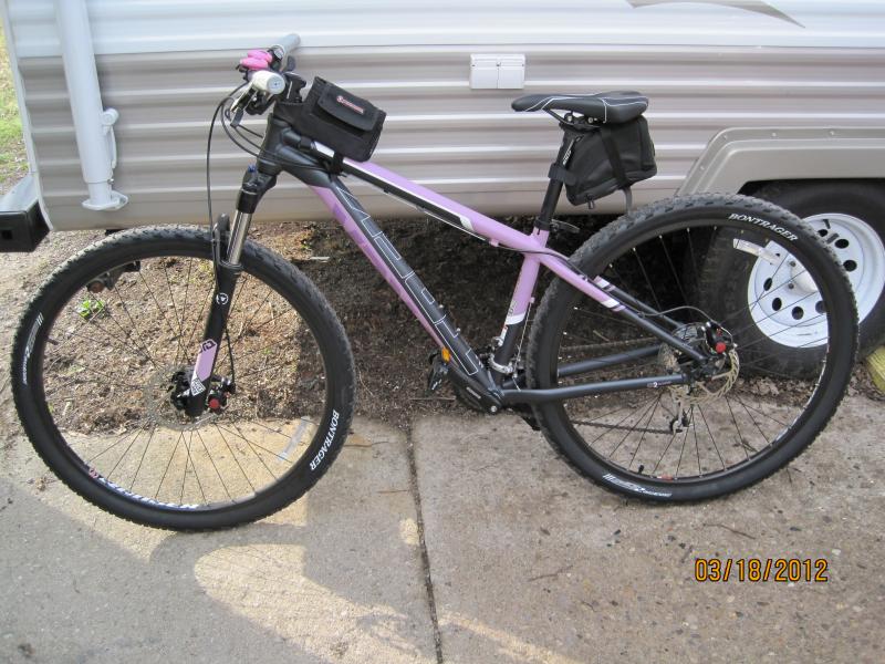 Just picked her up Thursday, she was in layaway. 2011 Trek (Gary Fisher) Mamba 29er. It was the last one my LBS had on clearance. I got her for $700. I haven't been on the trails with her(too muddy), but took a ride on the bike path - very nice and fast.I also had to include a photo of my road bike - Specialized Secteur Elite Compact. I'm trying to decide what color to accessorize the Mamba with - yellow or lime green - water bottle cages and pedals?? Any suggestions? My road bike was just too 'blah' so I added the pink accents.