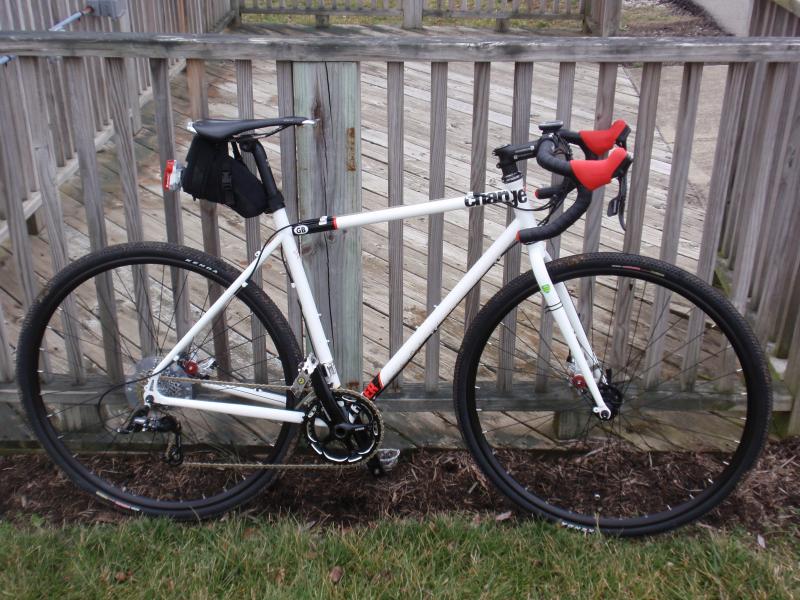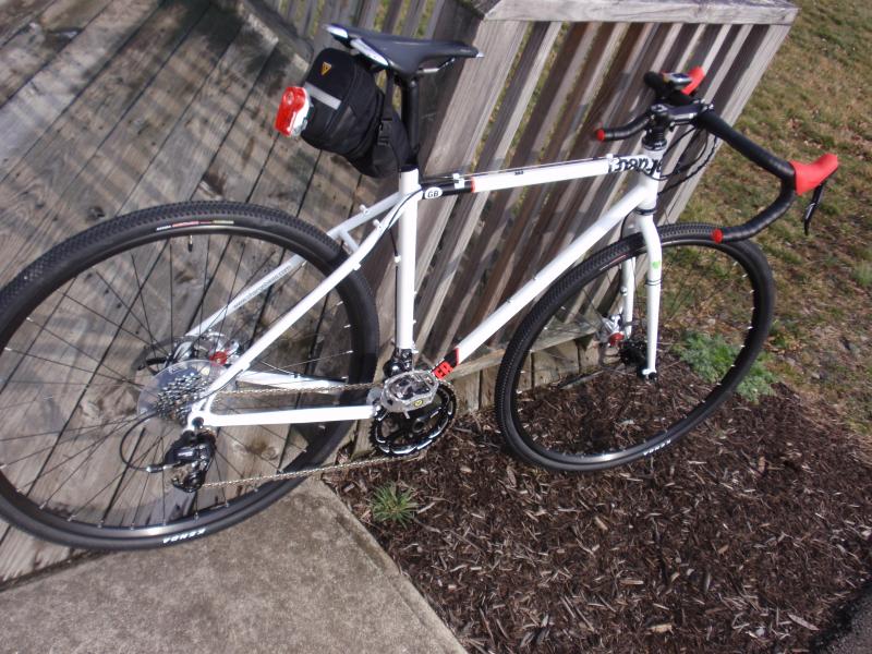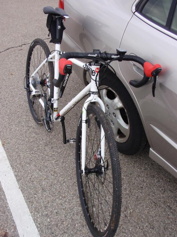 It rides very nicely--not that I ever doubted steel. (I am running a lower-pressure tire, though. Riding on pavement with knobblies is weird!) It's not as fast as my road bike, but I didn't buy it for that. I'm still getting used to the SRAM shifters. I find the rear almost intuitive. The front...not so much. I'm sure I'll figure it out eventually. The hoods are very comfortable, though! The disc brakes are awesome, and given that it was somewhat wet and muddy, even on the paved path, I'm glad I had them. I even experimented a little with going off-road...although that was mostly in the grass next to the trail. If I'm going to ride with my CX-racing work buddies, I have some serious work to do!
