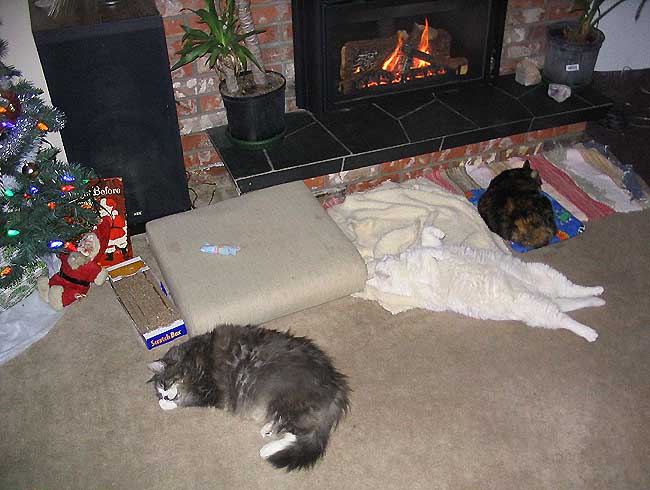 I had a rabbit once who used to love to snooze by the fire - RIGHT by the fire. Once, he fell asleep, rolled over and rolled right off the 4 inch hearth, and ended up flat on his back, legs sticking up a la' that white cat. And still he continued to snooze away!