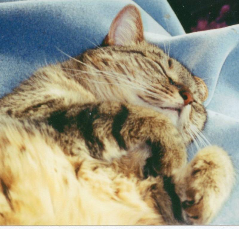 My last cat, is Phoenix. I rescued her on St. Patrick's Day 2006. She, I suspected had been dumped by some people in the apartment complex where my boyfriend lives. She had been hanging around his apartment for over a week begging for food and pets. She reminded me a lot of my buddy Scooter so she came home with me. Once home I discovered she had been declawed and on close inspection I learned she had been spayed. I guess her previous owners moved and decided to toss her for no one answered my ad in the newspaper or had posted any "lost" signs at the local clinics, complex office or pet stores. She is a real bed hog!