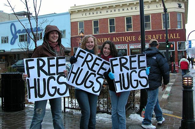 there is a woman who went around with a placard on sayiong FREE HUGS in london.